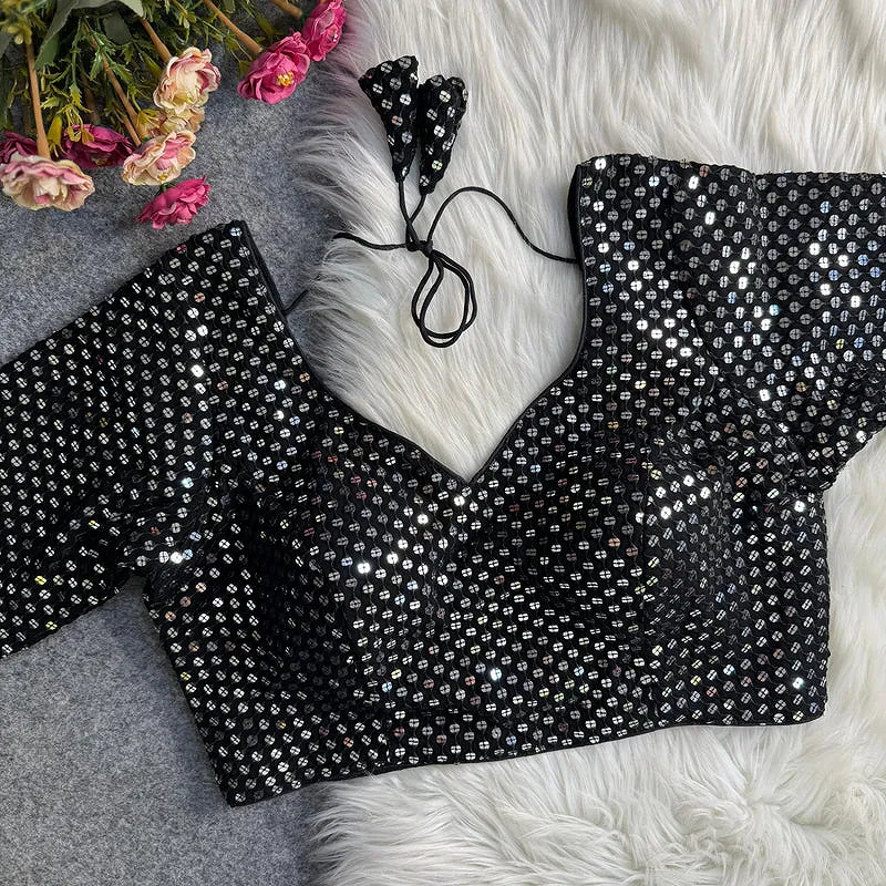 Mirror work blouses are vibrant and eye-catching. Popular for festive occasions, they reflect light and add a traditional yet trendy touch. These blouses work best with bandhani or colorful sarees for functions like garba and sangeet.