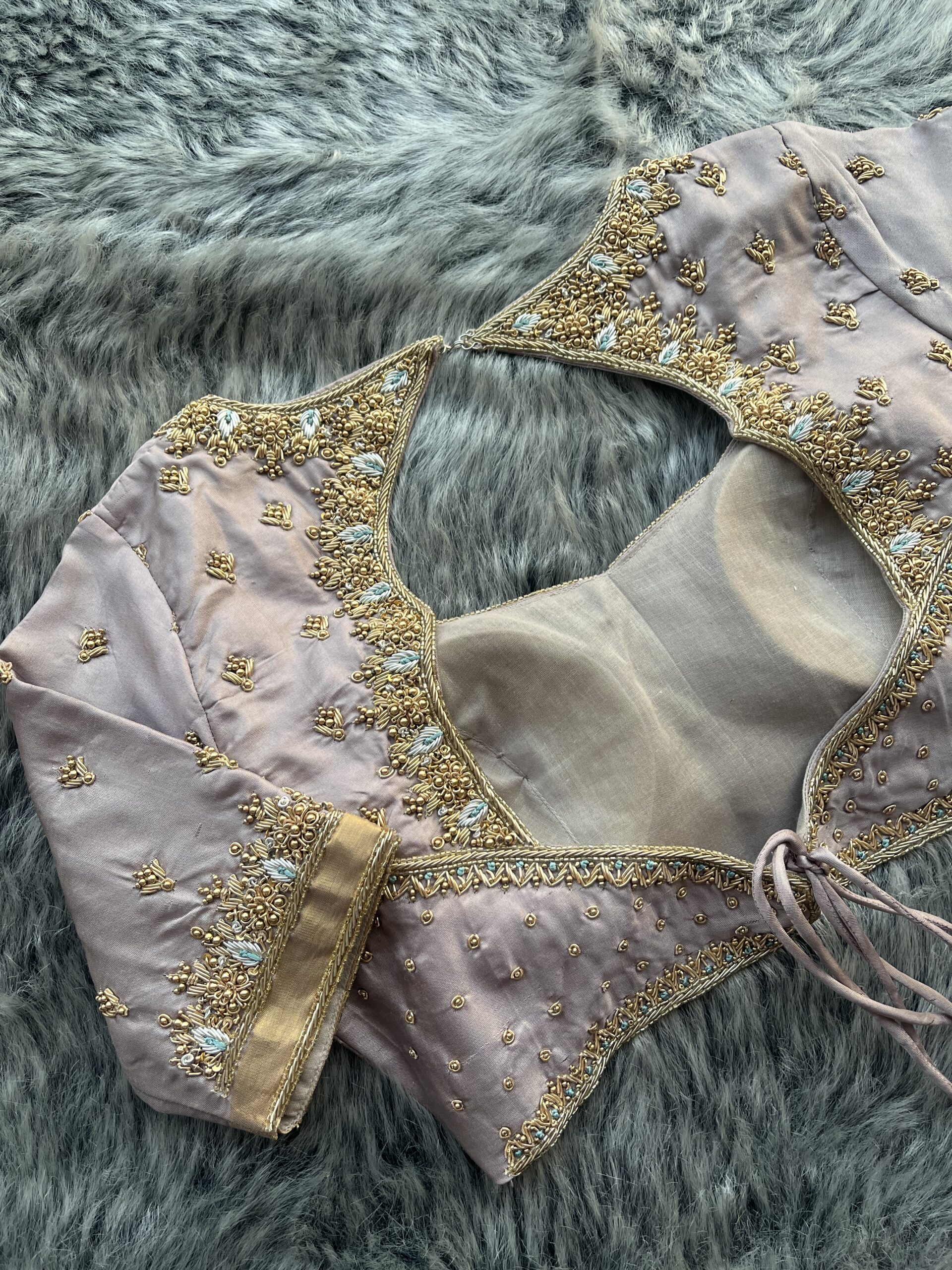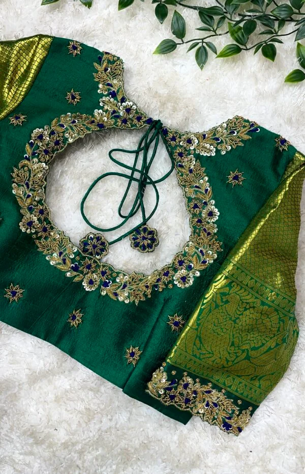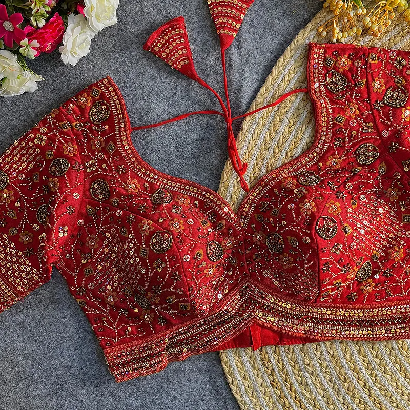 A1. A handwork blouse is a designer blouse crafted with detailed embroidery like zari, beads, sequence, thread work, or mirror work, giving it a rich and premium look.