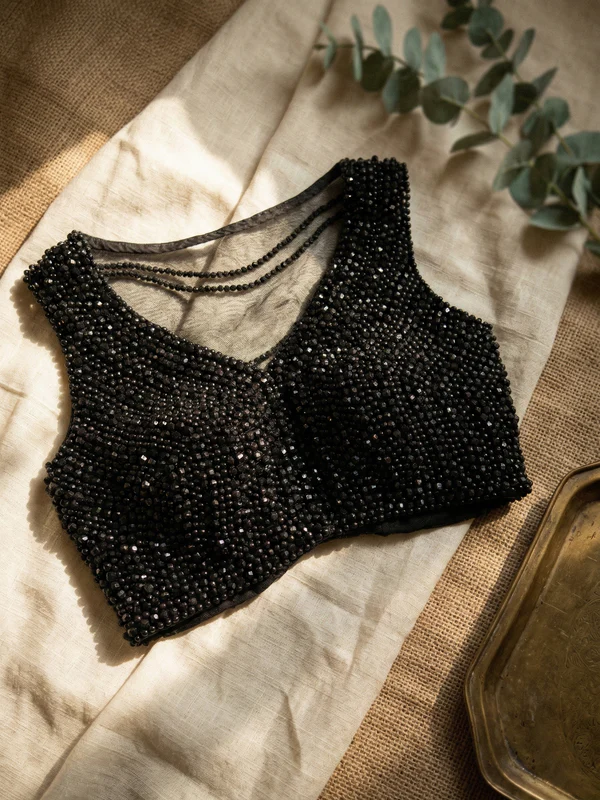 Blouses with beads and sequence work give a glamorous and sparkling finish. Perfect for evening parties and festive occasions, this style reflects light beautifully and enhances your overall look. It pairs well with georgette and net sarees for a modern vibe.