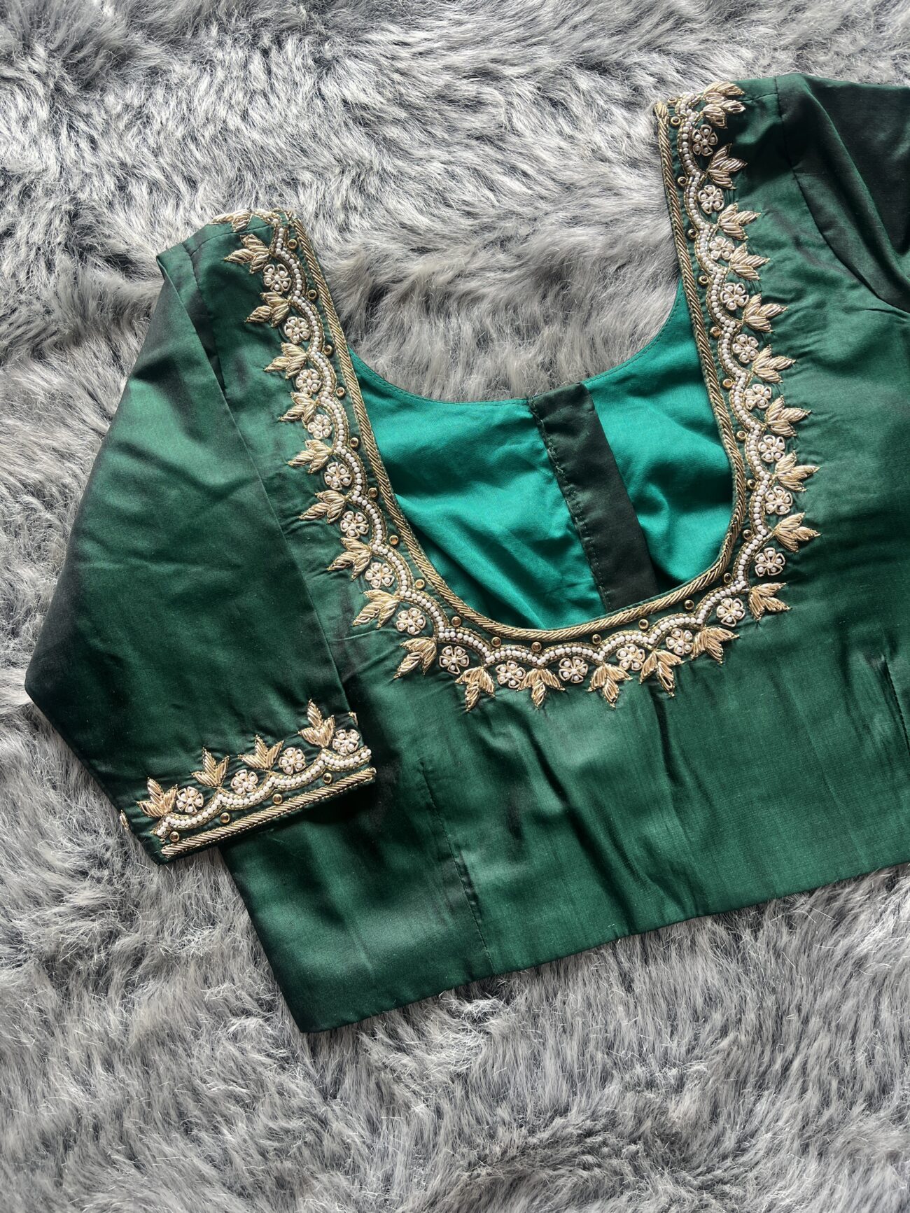 Pearl handwork blouses offer a soft and classy look. The subtle shine of pearls adds elegance without being too heavy. These are perfect for engagement ceremonies, receptions, and sophisticated festive events.