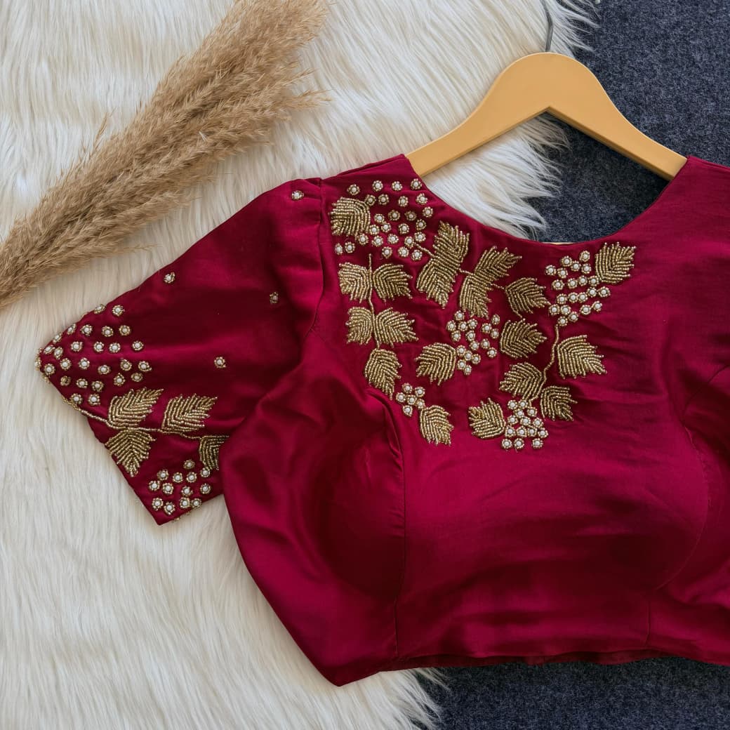 Zari work is a classic element in silk blouses. It adds richness and elegance, making it ideal for bridal wear. Gold zari work on silk fabric creates a luxurious and traditional vibe.