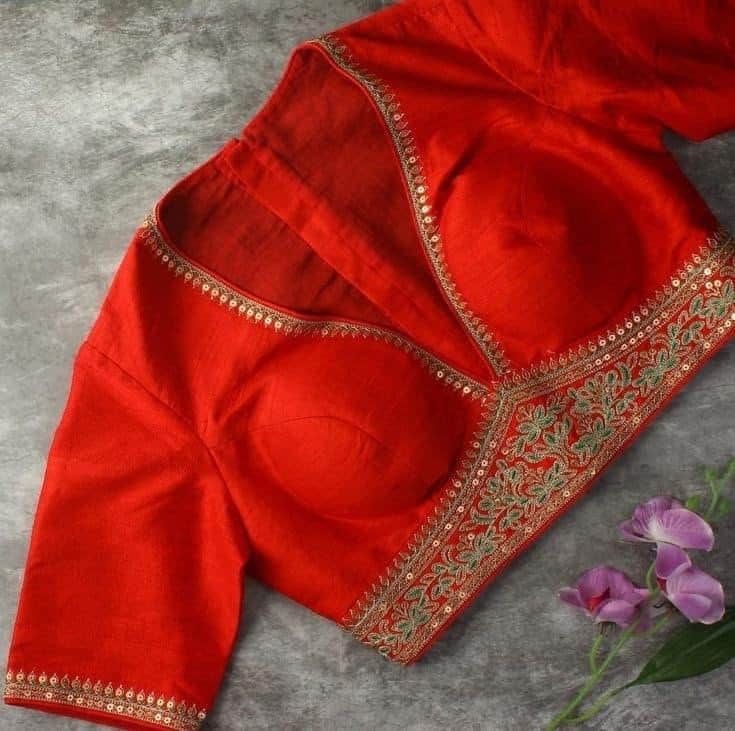 Boat neck silk blouses are trending for their elegant and sophisticated look. This neckline enhances the shoulder area and works well with heavy sarees, giving a balanced and graceful appearance.