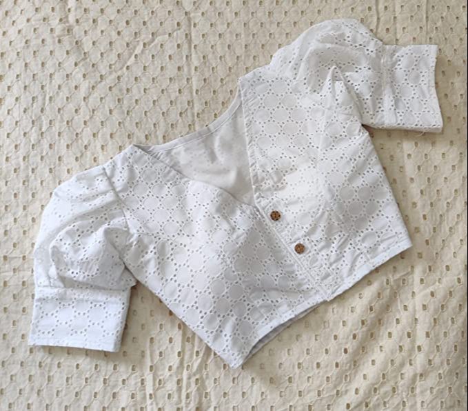 Puff sleeves add a touch of cuteness and vintage charm. This design is trending among young girls and looks great with printed cotton sarees.